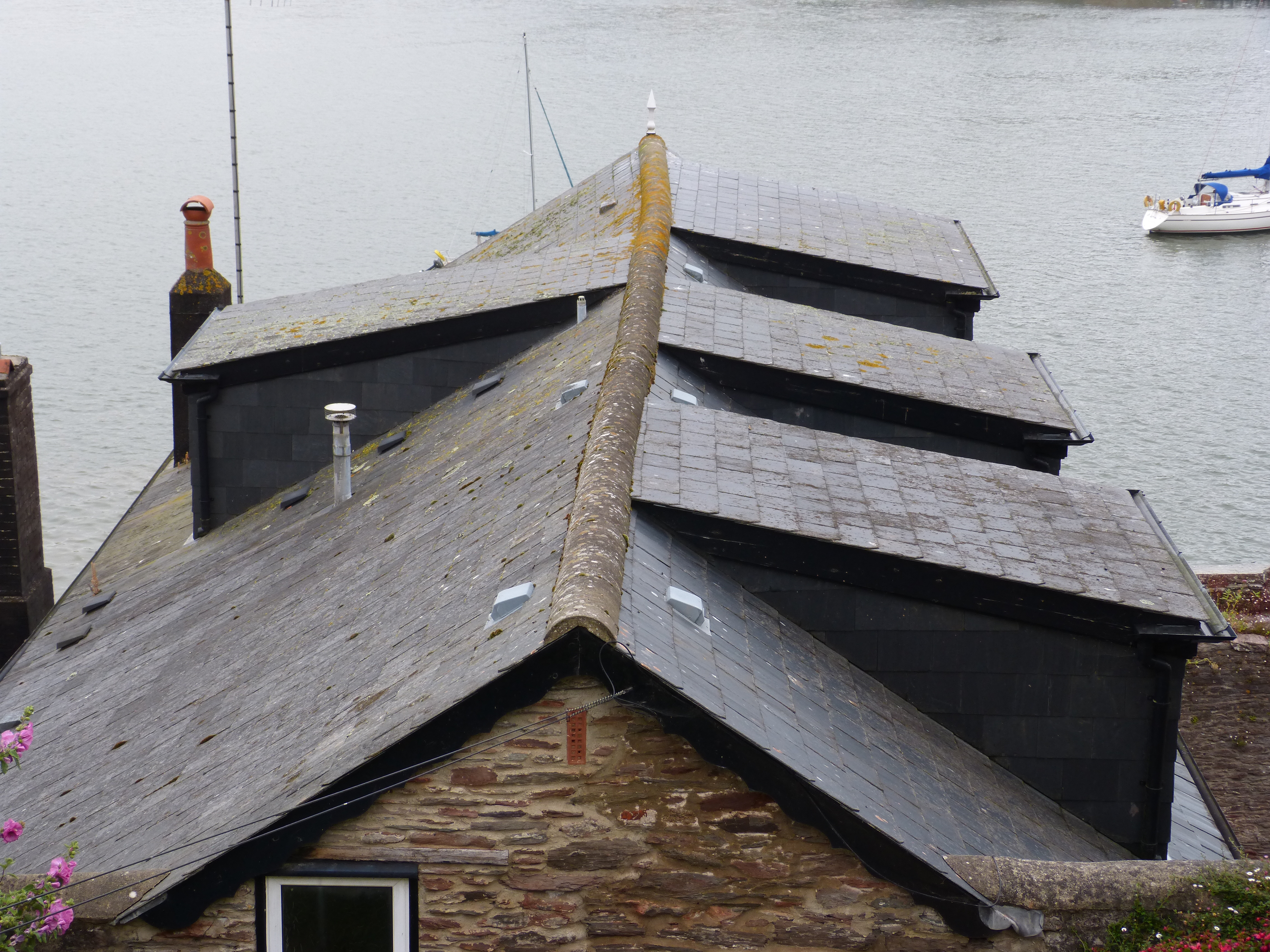 of Joe's Artsy-Fartsy Snapshots| This beautiful pig statue (with a brand new red ribbon) was watching the front of a cottage along the rising road from the pier to Dittisham town center. He was just a few doors up from the FBI tavern so he might be a bit tipsy. | A slate roof top on a Dart-side house along the road to Dartmouth Castle. Next door young men were repairing a similar roof when they weren't watching football or chinning themselves on the scaffold poles. |